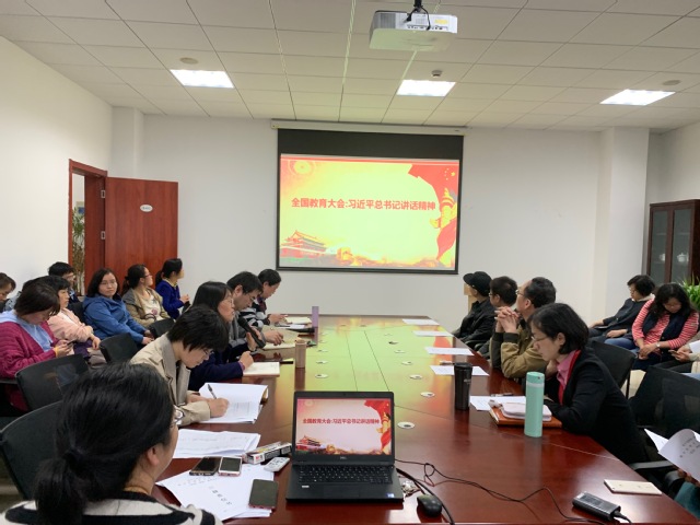 潘耀芳书记带领全院教职工以PPT的方式进行了学习。她重点介绍了全国教育大会上习近平总书记讲话精神。强调,在党的坚强领导下,全面贯彻党的教育方针,坚持马克思主义指导地位,坚持中国特色社会主义教育发展道路,坚持社会主义办学方向,立足基本国情,遵循教育规律,坚持改革创新,以凝聚人心、完善人格、开发人力、培育人才、造福人民为工作目标,培养德智体美劳全面发展的社会主义建设者和接班人,加快推进教育现代化、建设教育强国、办好人民满意的教育。