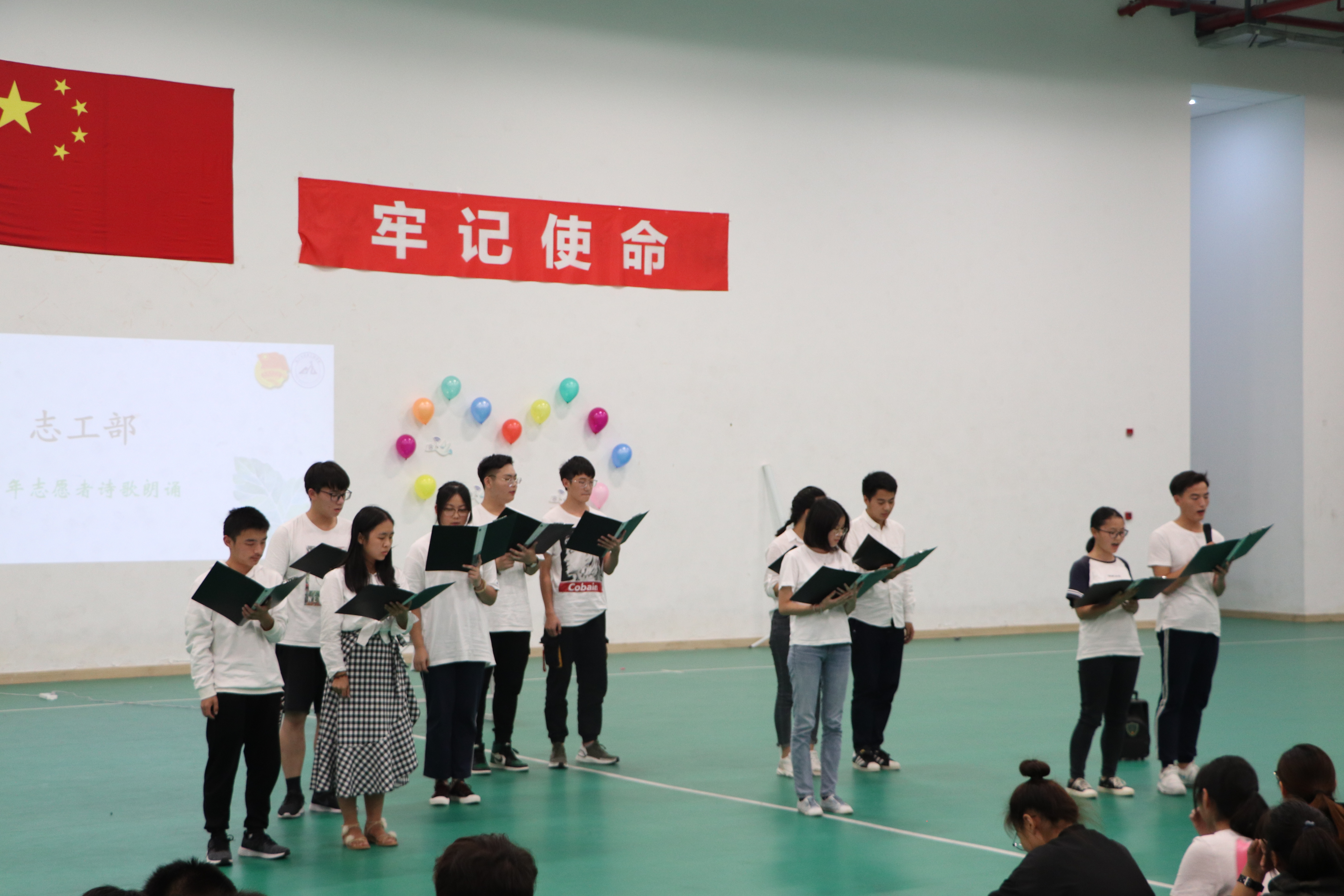 志工部为我们带来朗诵青年志愿者诗歌,素拓部为我们带来的节目---说好不哭,你哭了吗?办公室为我们带来朗诵青春中国,体育部为我们带来你好玛丽龙,生活权益部为我们带来舞蹈健康之舞