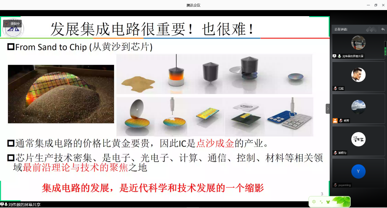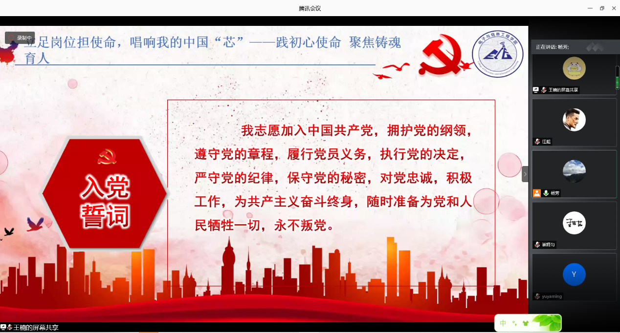 7月15日下午,太阳成集团tyc9728电子科学学科教工党支部专题组织生活展示在腾讯会议举行。此次活动主题为“立足岗位担使命,唱响我的中国‘芯’”。由电子与信息工程公司党委副书记周冬梅主持,电子科学学科教工党支部全体党员以及各公司党员代表参加了此次活动。