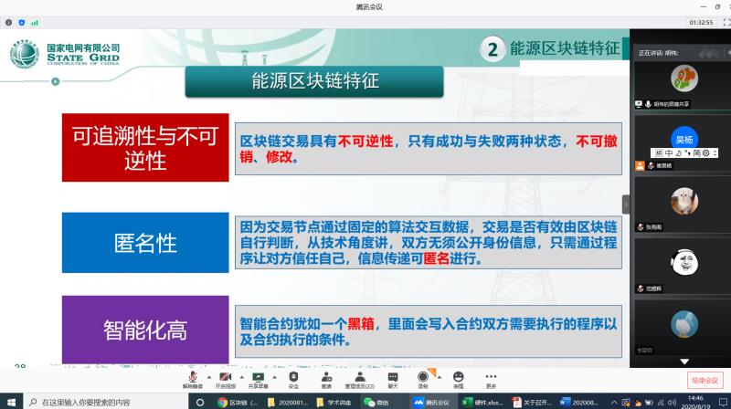 2020年8月19日下午,电力设备监测与安全团队,崔昊杨、秦伦明等老师和研究生,共同听取胡伟老师主讲的《能源区块链》的学术报告。
