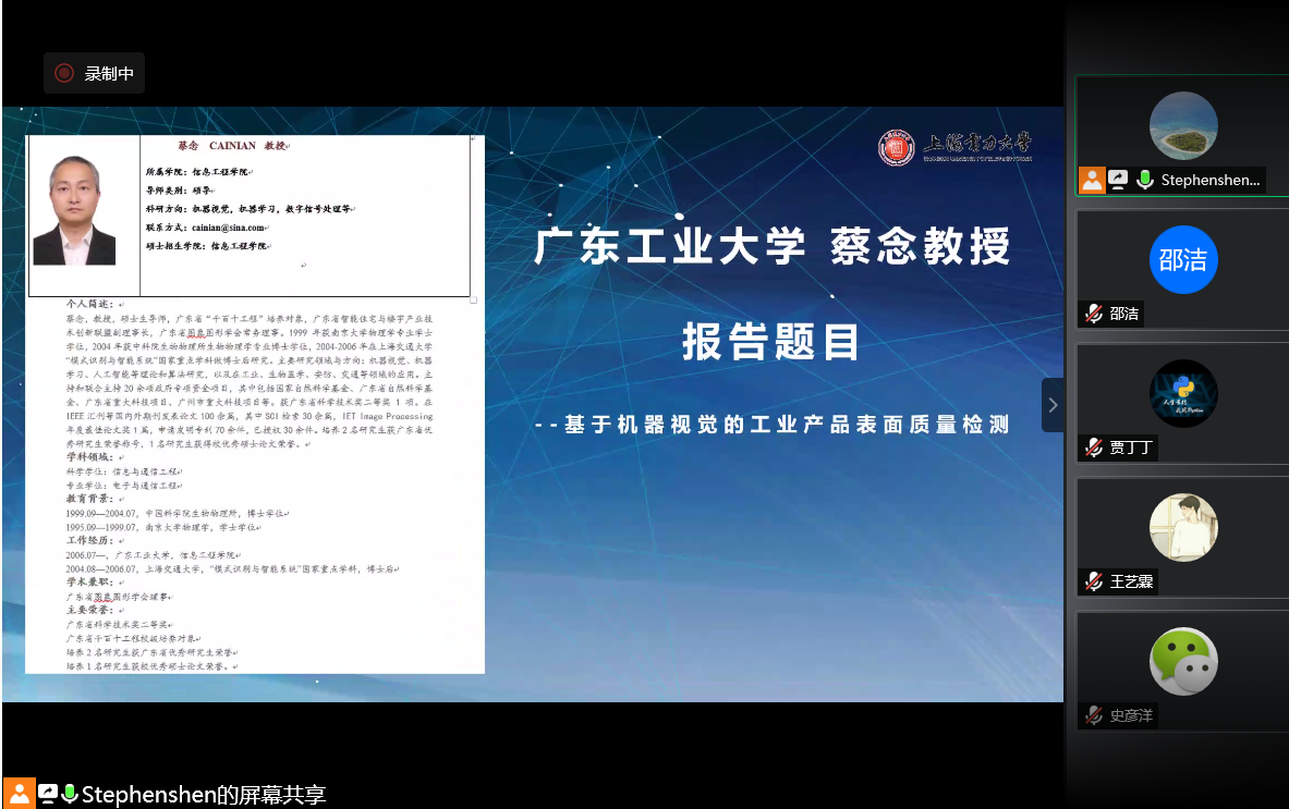 2020年9月25日下午,电力数据可视化团队沈文忠,邵洁,刘丹丹,赵倩等老师及多名研究生共同听取了广东工业大学蔡念教授题为“基于机器视觉的工业产品表面质量检测”的学术报告。