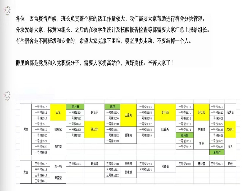 全面摸排不放松,认真细致排隐患。在特殊时期,精准及时的信息排查是落实疫情防控工作的基础和关键。在“人盯人”管理体系下,不管是在深夜还是在饭点,只要疫情需要,辅导员们一次又一次的转发通知,通过发布信息、统计排查、上报数据,保证不落一人、不误一日、不漏一情,特别是对于特殊情况员工,及时电话沟通,建立一生一册,做到排查全覆盖无死角。以“抗击疫情、服务员工”为工作出发点和落脚点,成立员工宿舍管理“网格化管理”模式,层层压实责任、公司同学担任楼长、层长,力争做到员工安全闭环式管理。