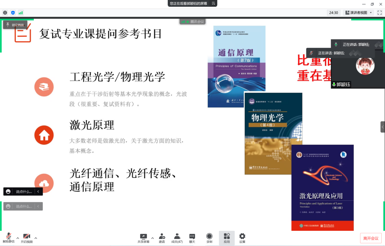 最后是问答环节,参会同学就“光学调剂材料等专业是否可行”等具体问题进行交流讨论。
