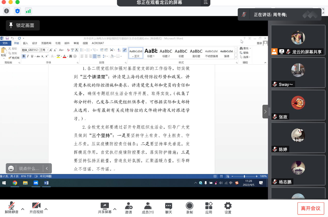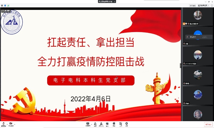 为进一步传达党中央、教育部、上海市疫情防控有关精神和要求,明确上海高校疫情防控形势和公司疫情防控要求、明确党支部与党员的责任与义务,引领党员充分发挥党员在防疫工作中的先锋模范作用,电信公司各党支部在4月5-6日召开疫情防控专题组织生活会。