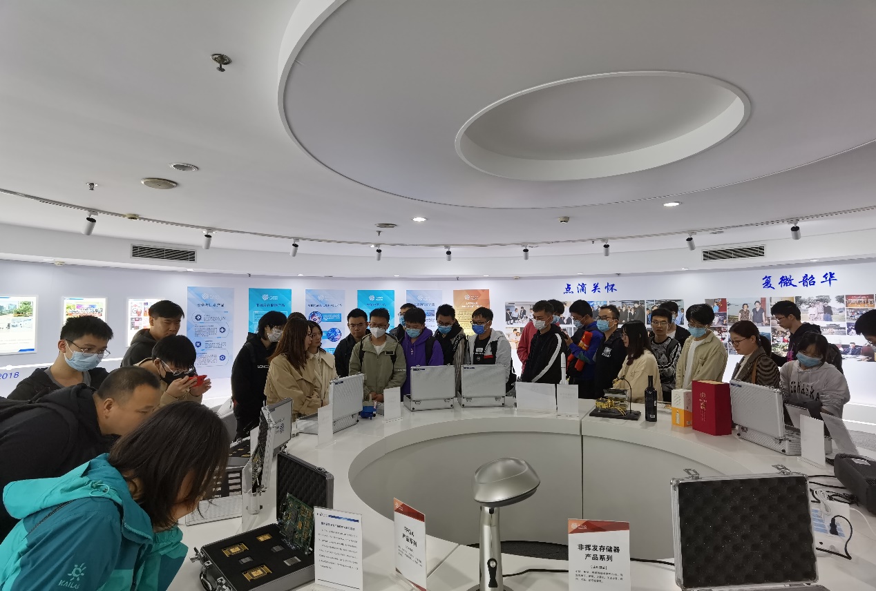 师生一行来到复旦微电子的杨浦分部,吕沁沁对电信公司师生的来访表示欢迎并结合宣传视频介绍了复旦微电子的基本情况。该公司是国内从事超大规模集成电路的设计、开发、生产(测试)和提供系统解决方案的专业公司,是国内成立最早、首家上市的股份制集成电路设计企业,现已形成安全与识别、智能电表、非挥发存储器、智能电器、可编程器件FPGA、互联网创新六大成熟的产品线和系统解决方案,产品行销30多个国家和地区。随后吕沁沁在展览厅带着师生了解了公司创办以来的历史和取得的成就,复旦微电子自1998年成立以来,经过筚路蓝缕的创立期和追求卓越的成长期,逐步形成了信任尊重、诚实守信、激情创新、领先卓越的企业文化,正逐步成为国内乃至国外一流集成电路设计企业。
