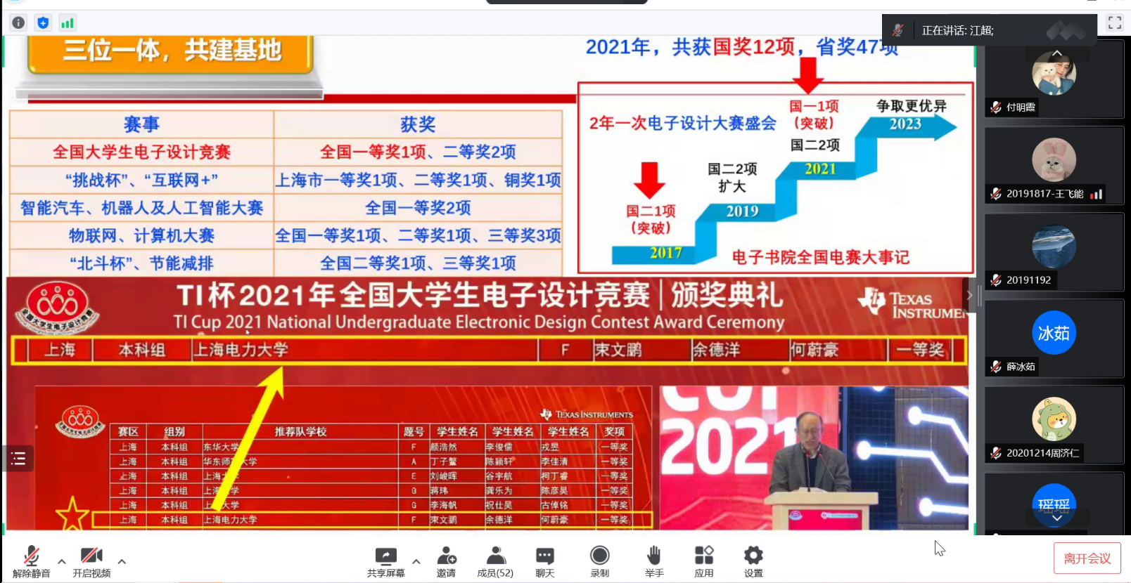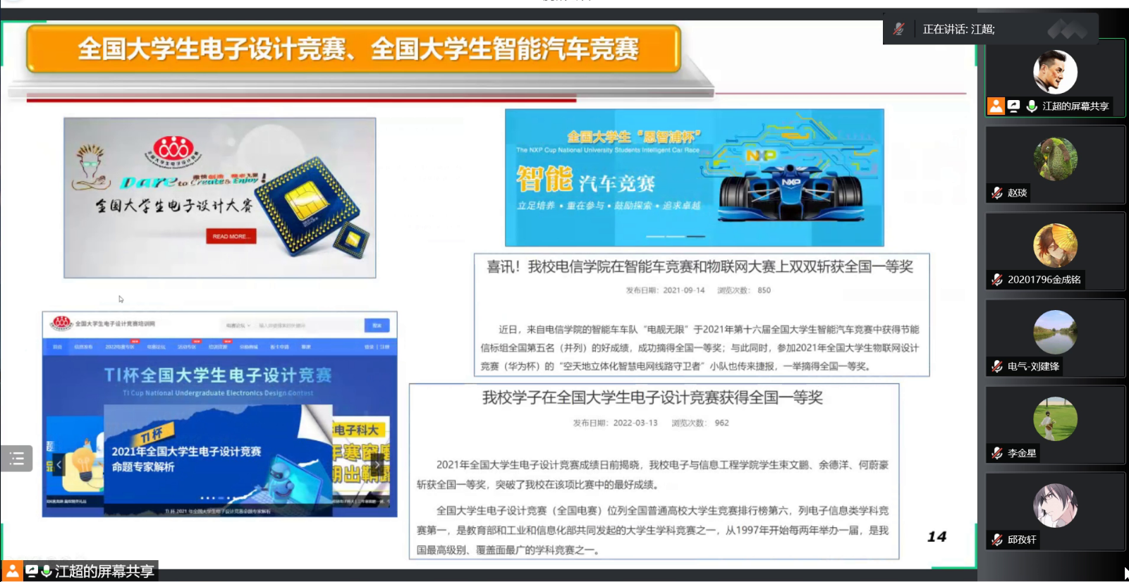 江超老师从专业、学科、工程教育认证的12条毕业要求以及“互联网+”老员工创新创业大赛切入主题,创新创业教育是一个系统性的工程,与公司产品相辅相成,同为一脉。解读了公司创新创业训练与实践学分管理办法以及本科生科研能力提升计划管理办法。详细介绍了电信公司创新创业教育基地--电子书院-科创中心-电子学社一体化窗口建设,回顾了近年来公司在互联网+、挑战杯、电子设计竞赛、智能汽车竞赛等各类含金量颇高的赛事中的辛勤付出与收获。以及双创基地在社会服务方面做出的突出贡献:积极参加70周年校庆、招生宣传、校宣传片拍摄等活动;2次承办临港大学堂科创小英才太阳成集团tyc9728创客未来夏令营活动;2021年以来走出校园,科普宣讲十余场次,服务上千名中小员工。