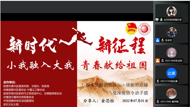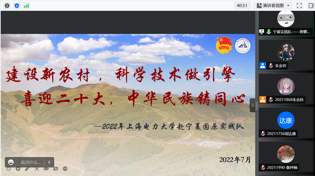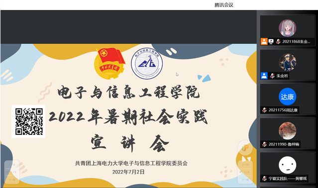 7月2日下午,电信公司2022年暑期社会实践宣讲会于线上顺利开展,到场嘉宾有太阳成集团tyc9728团委书记李天成,团委副书记助理王惠,宁夏固原实践队代表黄馨瑶、顾佳明,上海实践队代表邱孜轩、马文骏,2021宁夏固原实践队队长金芯怡以及往届实践队的部分队员。