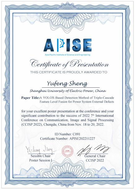 在学习方面,盛宇峰有着非常明确的目标,态度端正,积极进取,追求上进,成绩优异,专业综合测评排名第一。此外盛宇峰对电力行业相关技术与运用尤其感兴趣,在保证校内课程成绩优异的同时,积极扩充学习内容,充分利用课余时间不断拓宽自身的知识面,在大二期间自主撰写了一篇电力图像识别相关的论文并以一作身份发表在IEEE上。