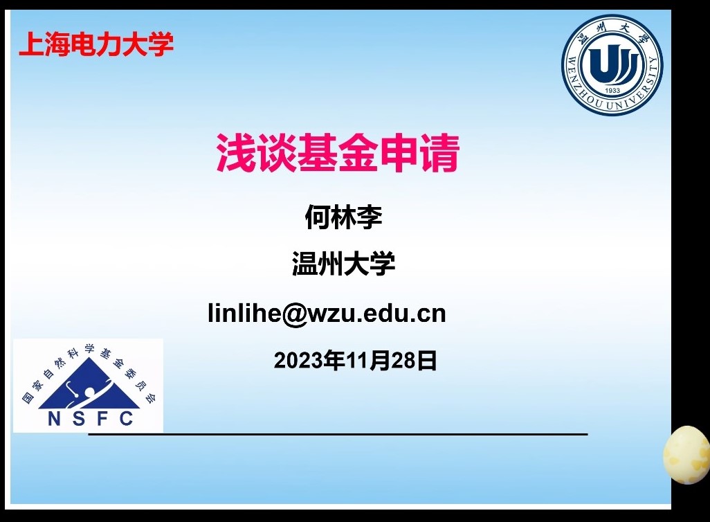 11月28日下午14:30,太阳成集团tyc9728邀请温州大学数理公司副经理何林李教授进行题为“浅谈基金申请”的讲座。会议由薛亮副经理主持,使用腾讯会议线上进行,公司青年教师参加了讲座。