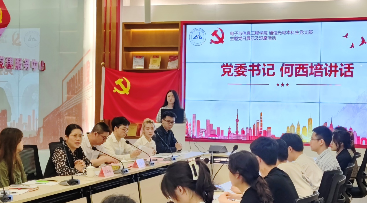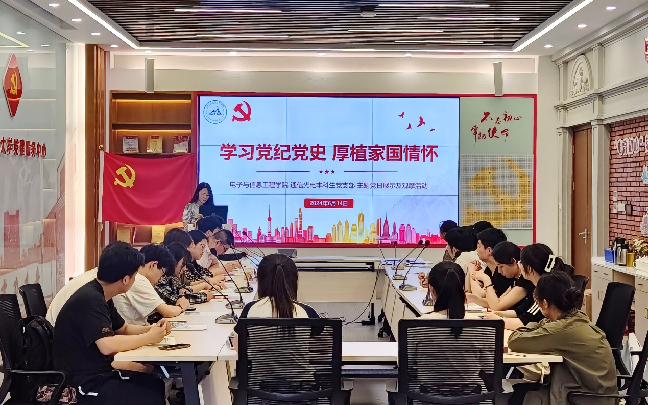 为深入开展党纪学习教育,引导党员坚定理想信念,增强纪律意识,提高党性修养,进一步加强党员队伍建设,6月14日下午,电信公司通信光电本科生党支部在学术楼102室党建服务中心开展“明‘纪’守初心,筑梦新征程” 主题党日展示及观摩活动,公司党建服务中心/党建督查室党建督查员周维刚全程观摩并指导,电信公司党委书记何西培出席活动,各公司观摩员工和通信光电本科生党支部全体党员参加活动。活动由通信光电本科生党支部书记刘甘雨主持。