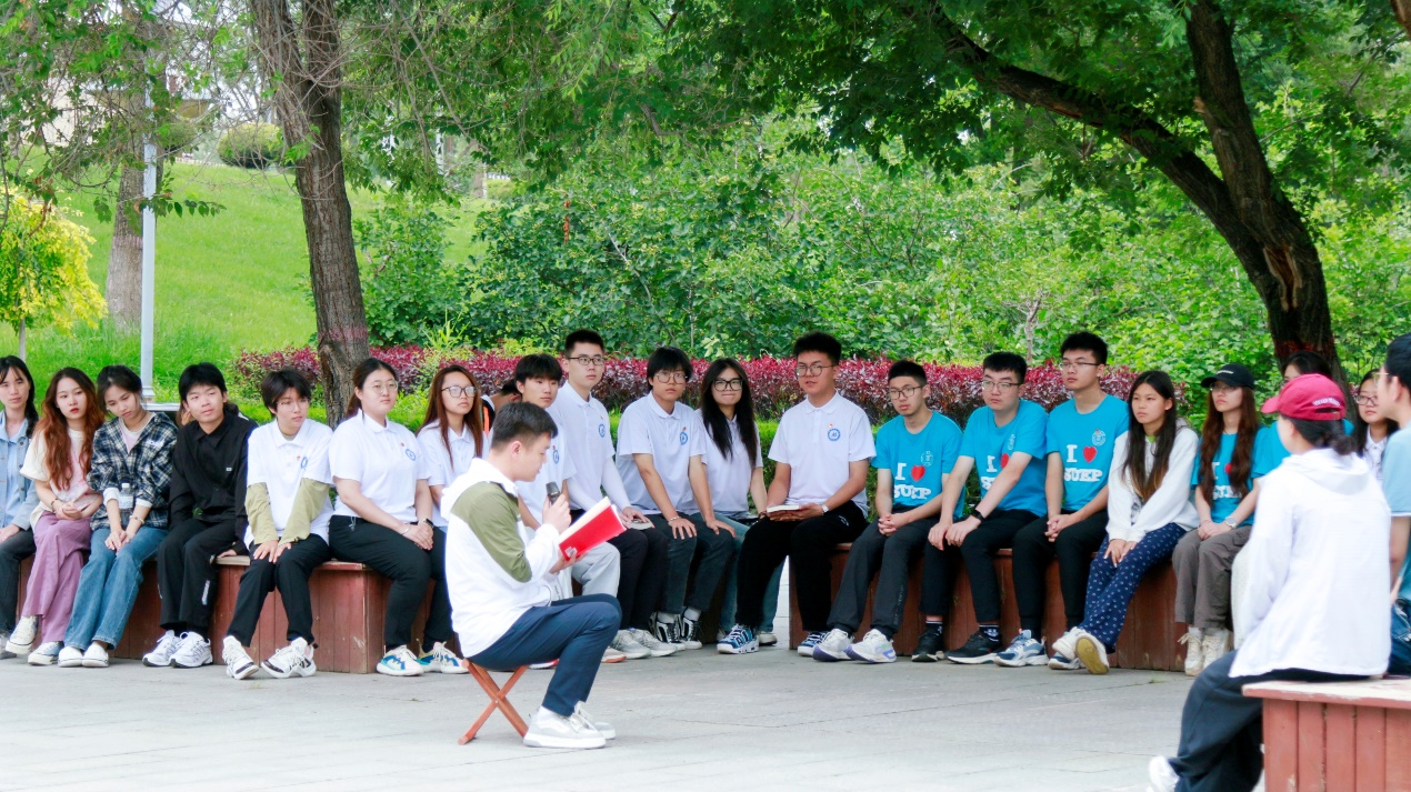 在将台堡红色广场,同学们集体学习微党课,交流《习近平与老员工朋友们》一书。