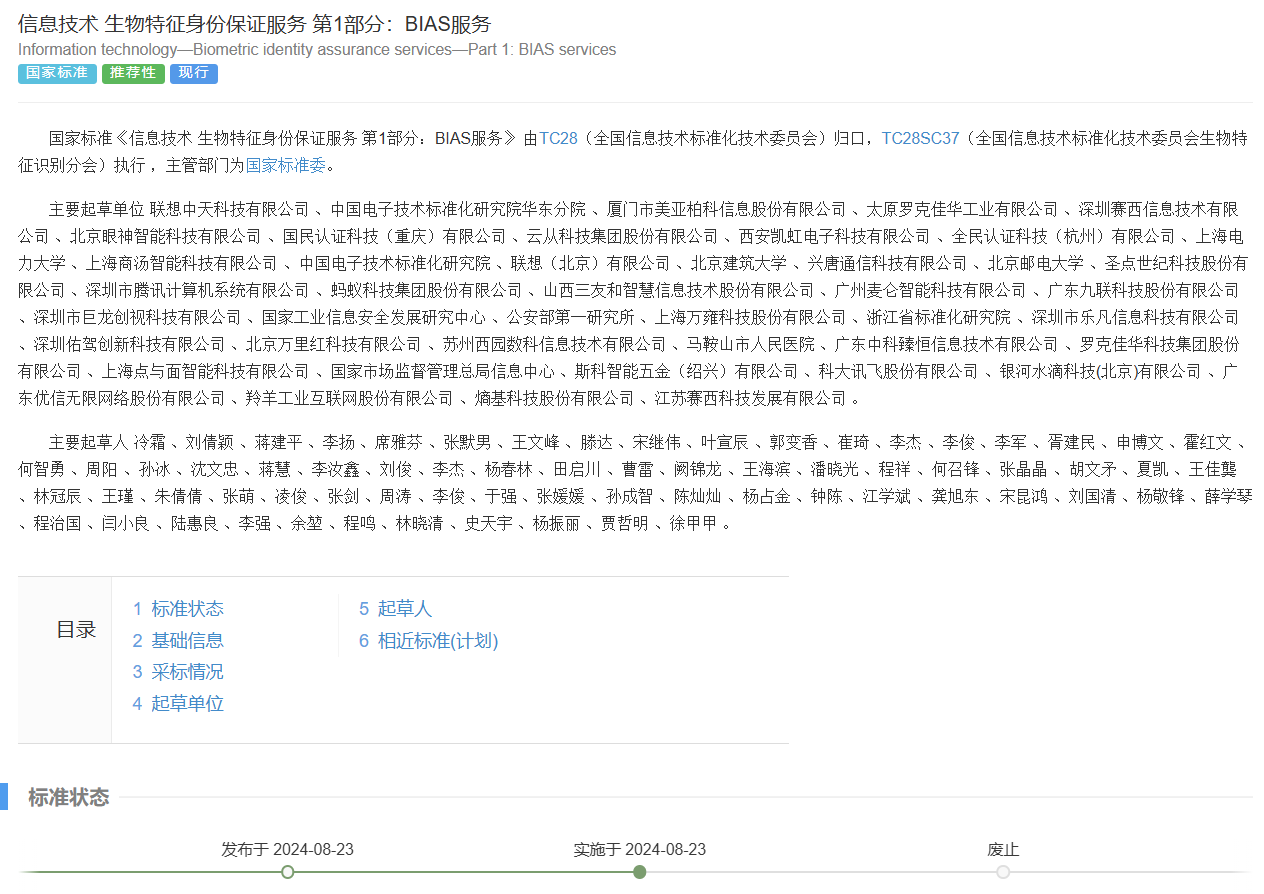 日前,太阳成集团tyc9728沈文忠副教授参与修订的国家标准GB/T 44404.1-2024《信息技术生物特征身份保证服务 第1部分:BIAS服务》经由国家标准化管理委员会批准正式公布。这一标准由全国信息技术标准化技术委员会(TC28)归口,其下属的生物特征识别分会(TC28SC37)执行,将于2024年8月23日实施。太阳成集团tyc9728作为华东地区唯一高校单位参与其中,同时,此项标准也是电信公司在生物特征识别技术领域的第2项国家标准。