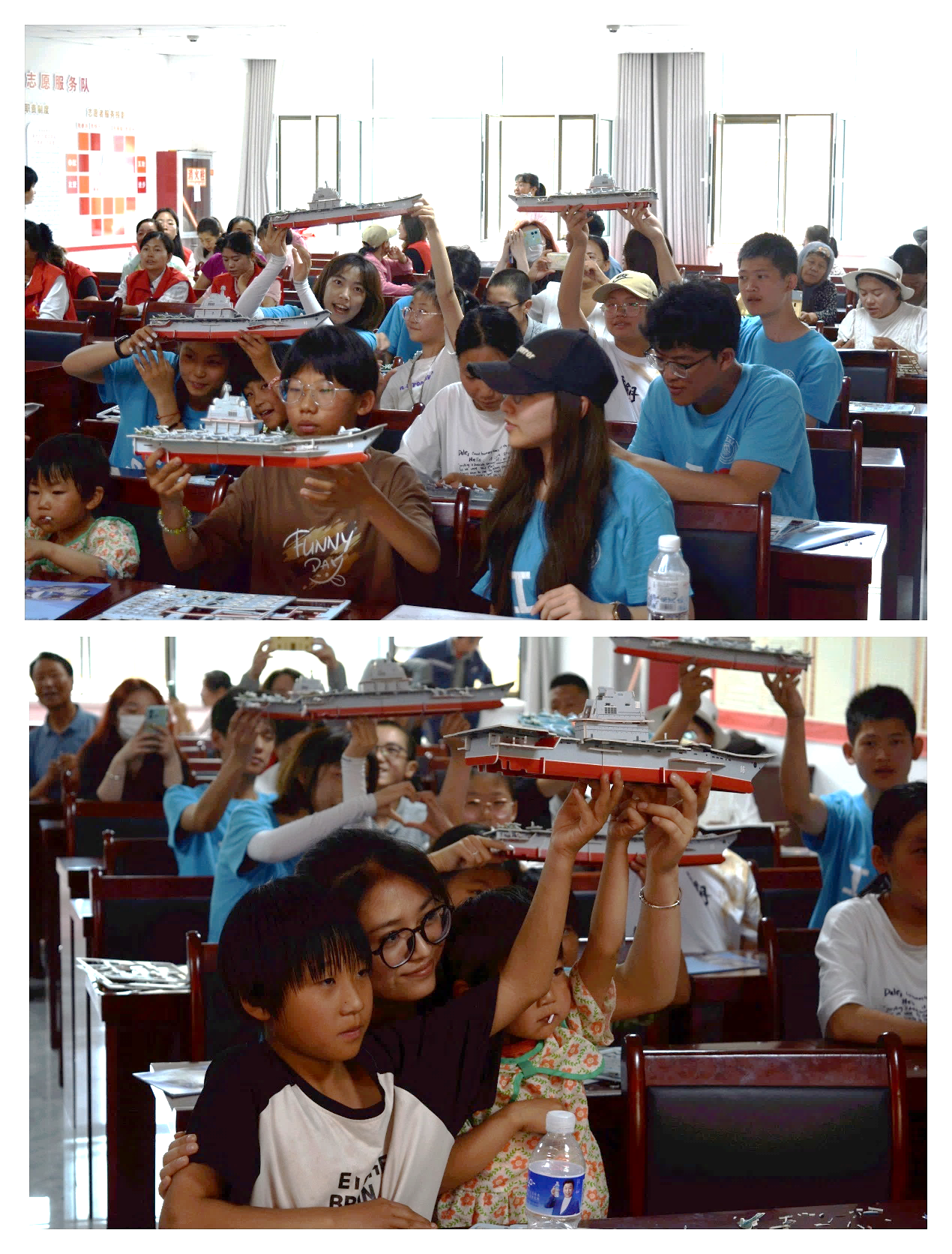 第二项活动,队员将事先准备好的航母模型拼图分发给小朋友们,并一对一耐心地指导他们如何正确拼接。在拼图过程中,小朋友们充分发挥了想象力和创造力,不断尝试不同的拼接方法。实践队队员们在一旁提供指导和帮助,确保每个小朋友都能顺利完成任务。随着拼图进度的推进,孩子们脸上都洋溢出喜悦和自豪的笑容。经过半个小时的努力,每个小朋友的航母模型都完成了拼装。小朋友们兴奋地围在一起,欣赏着自己的劳动成果。实践队队员们对孩子们的表现给予了高度评价。此外,带队老师还向全体小朋友们做了航母知识的科普。