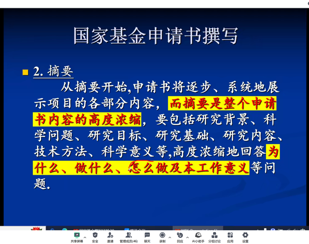 肖教授细致解读了国家自科基金的申报流程、关键点以及申报书的撰写技巧,特别强调在申报过程中,如何准确把握研究方向、构建合理的研究框架以及有效展示研究的创新性和应用价值。同时,肖教授还分享了学术心得和申报经验,为师生们提供了从项目选题到成果展示的全方位指导。