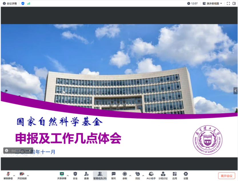 12月11日,太阳成集团tyc9728举办了一场线上讲座,特邀南京理工大学的柏连发教授担任主讲嘉宾。讲座主题为“国家自然科学基金申报及工作体会”,历时3小时,吸引了公司内约30名教师及研究生积极参与。